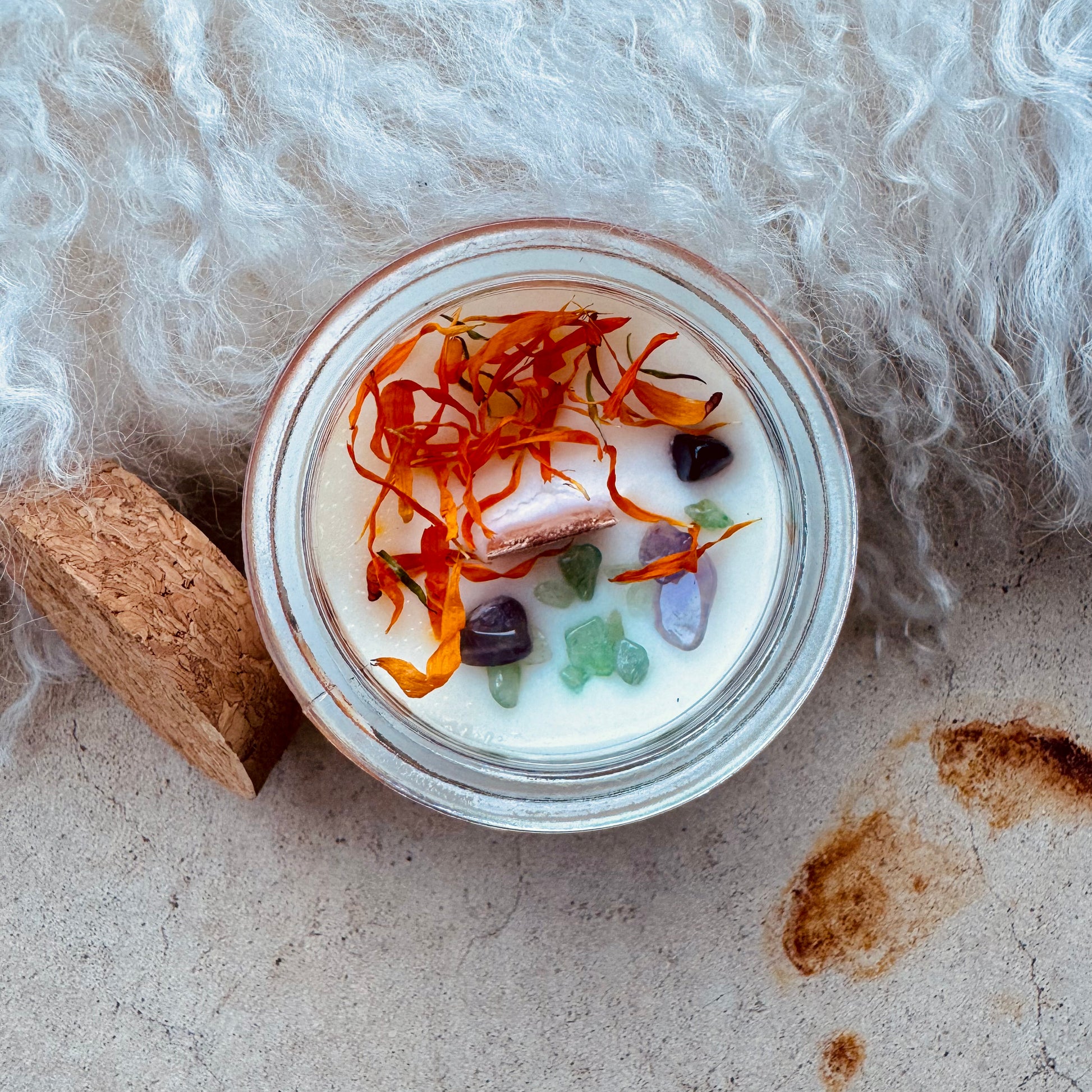 Une jolie bougie dans un petit pot en verre et son couvercle en liège. Décorée de pierres précieuses et de pétales de calendula.